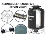 Tandon Air Mpoin Drain Adalah tandon air bebas kuras dengan Total Flush dan pipa transparan pada bagian bawah tangki sehingga mempermudah pengurasan.